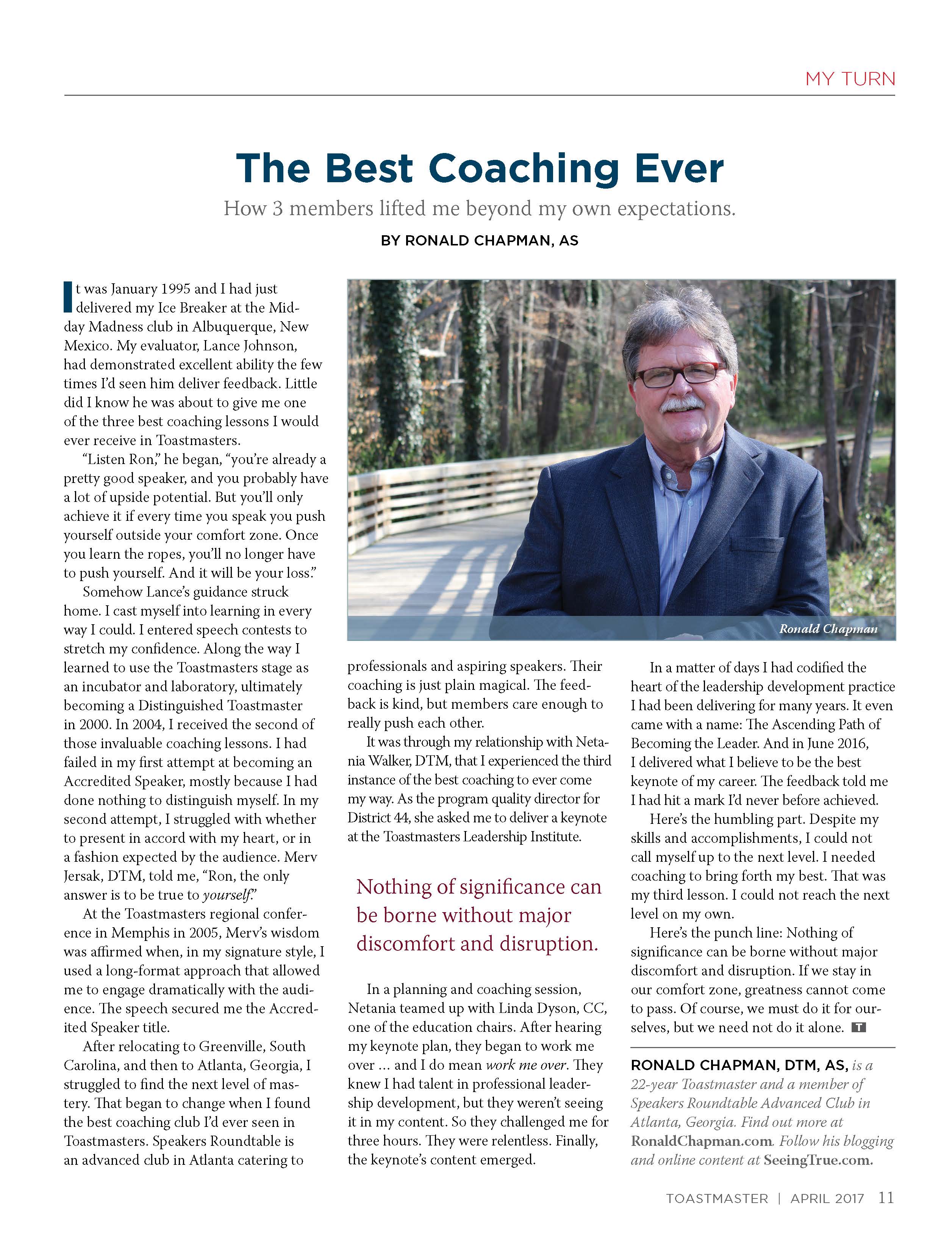 For more than twenty years Ron Chapman, Georgia’s only Accredited Speaker, DTM and a member of Speakers Roundtable, has worked deeply to build his skills. This month Toastmasters Magazine printed his commentary on the coaching within Toastmasters that has made all the difference to his growth and development. Click here to read the full article.
